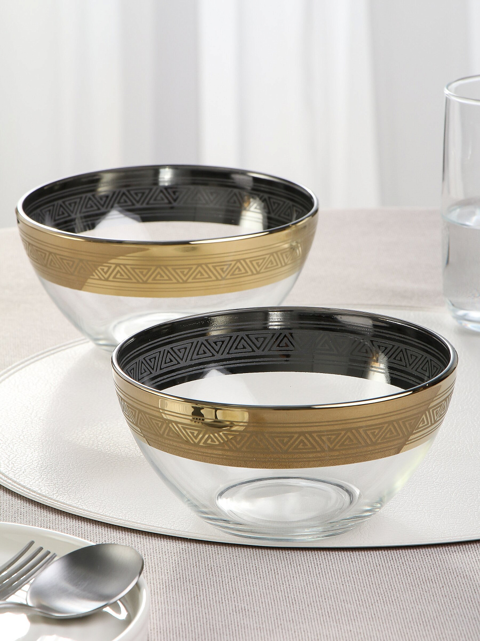 Каждый салатник имеет диаметр 15,8 см и высоту 7,8 см; форма круглая, материал — прозрачное стекло с золотой окантовкой и абстрактным рисунком.