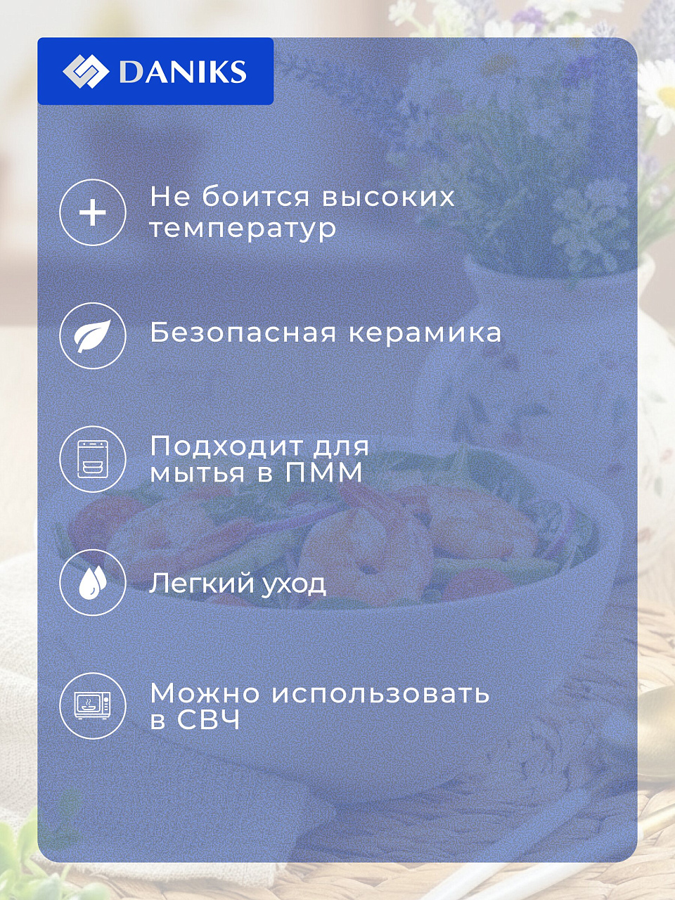 - Уникальная стеклокерамика: устойчива к перепадам температур, подходит для микроволновки и посудомоечной машины