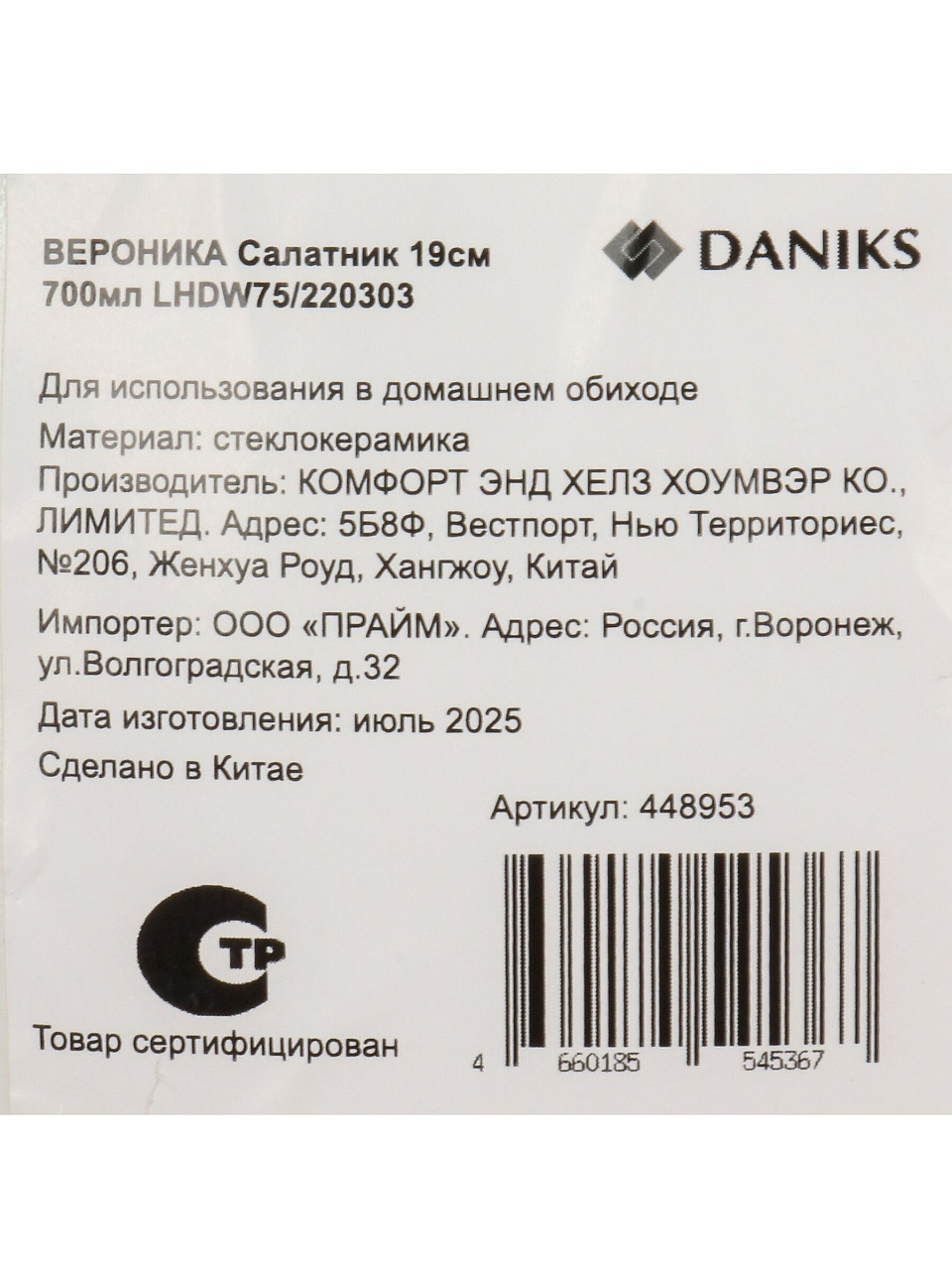Салатник Daniks Вероника изготовлен из прочной стеклокерамики, что гарантирует устойчивость к царапинам и перепадам температур. Благодаря округлой форме и объёму 0.7 л, он отлично подходит для салатов, закусок, фруктов и даже подачи горячих блюд. Часто спрашивают: «Можно ли использовать такой салатник в микроволновке?» — да, он полностью безопасен для СВЧ и посудомоечной машины, что упрощает уход и экономит время.