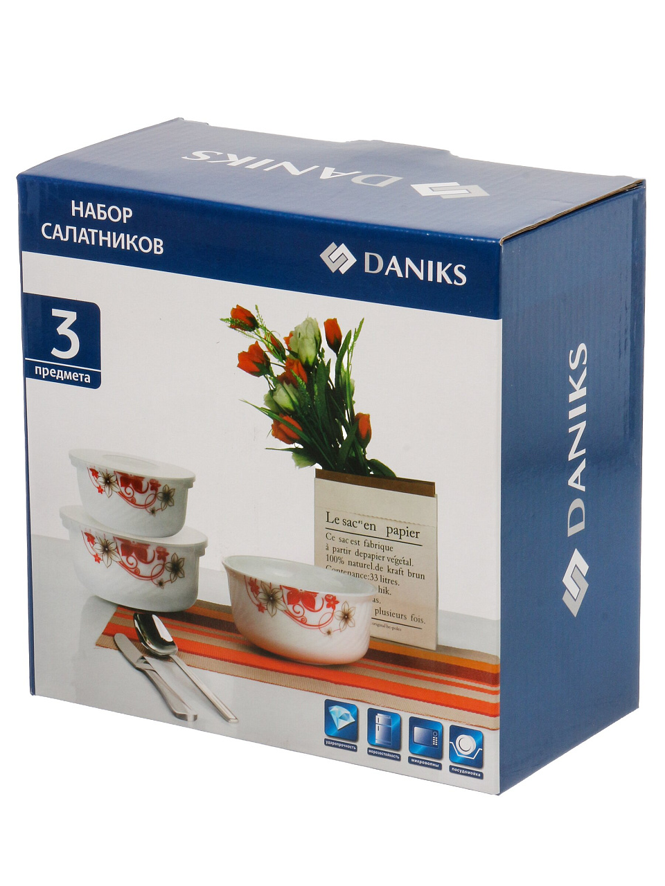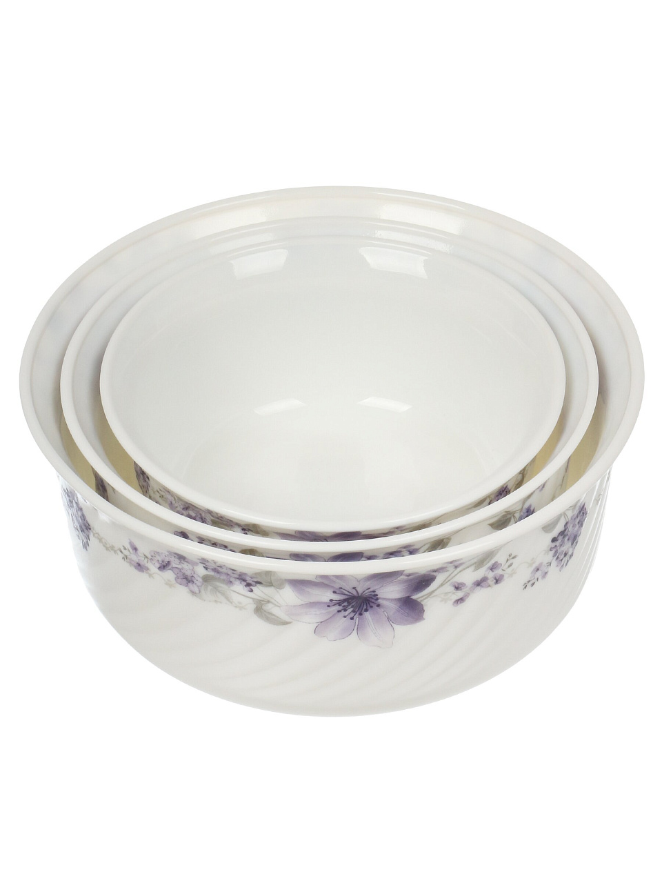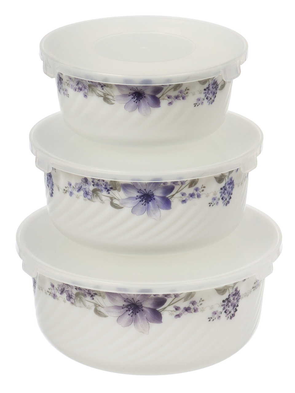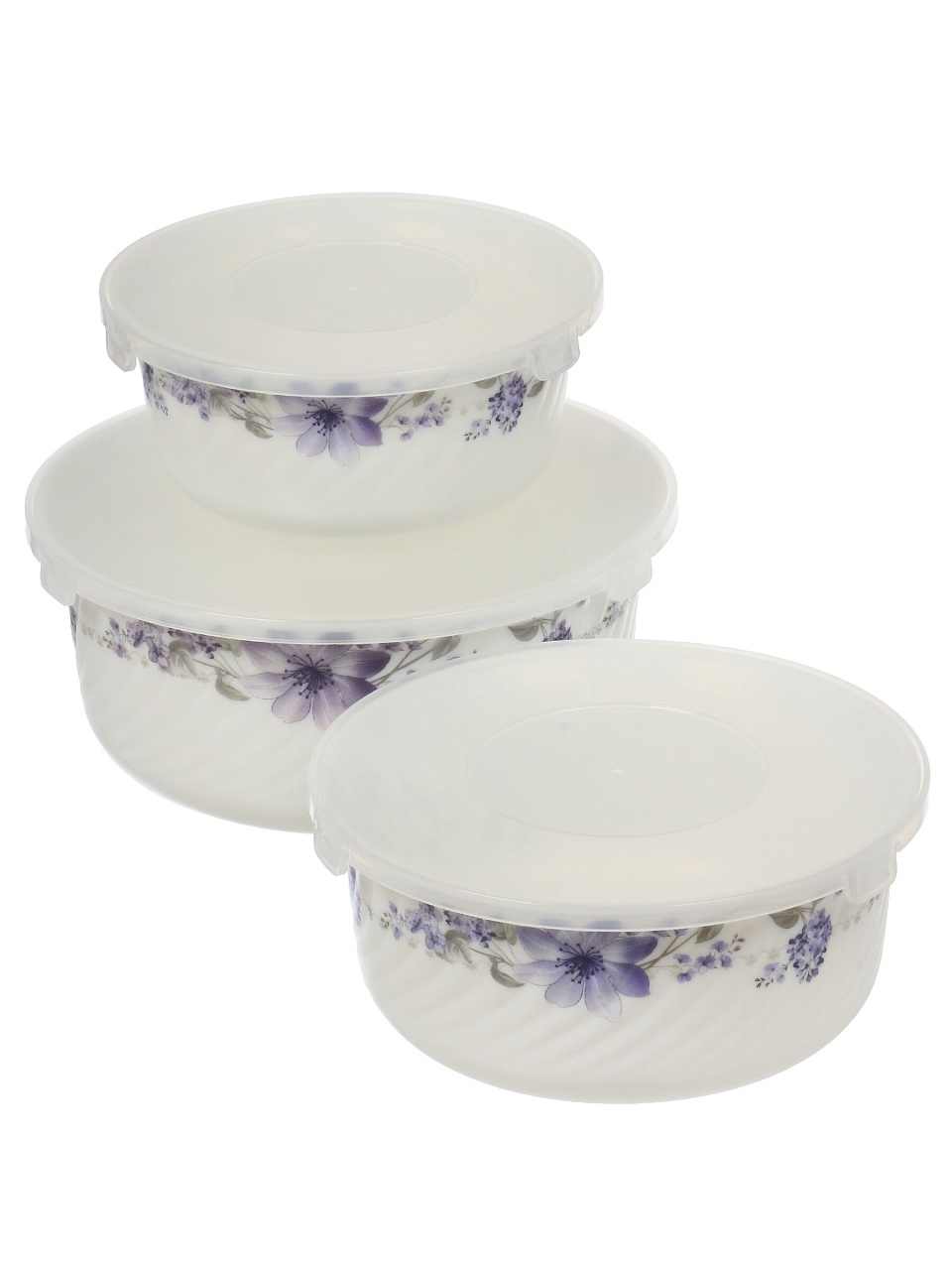 Салатники Daniks «Элегия» — набор из 3 круглых стеклокерамических мисок с крышками (0,5/0,8/1,4 л), белый цвет, стиль прованс. Идеальное решение для сервировки и хранения.