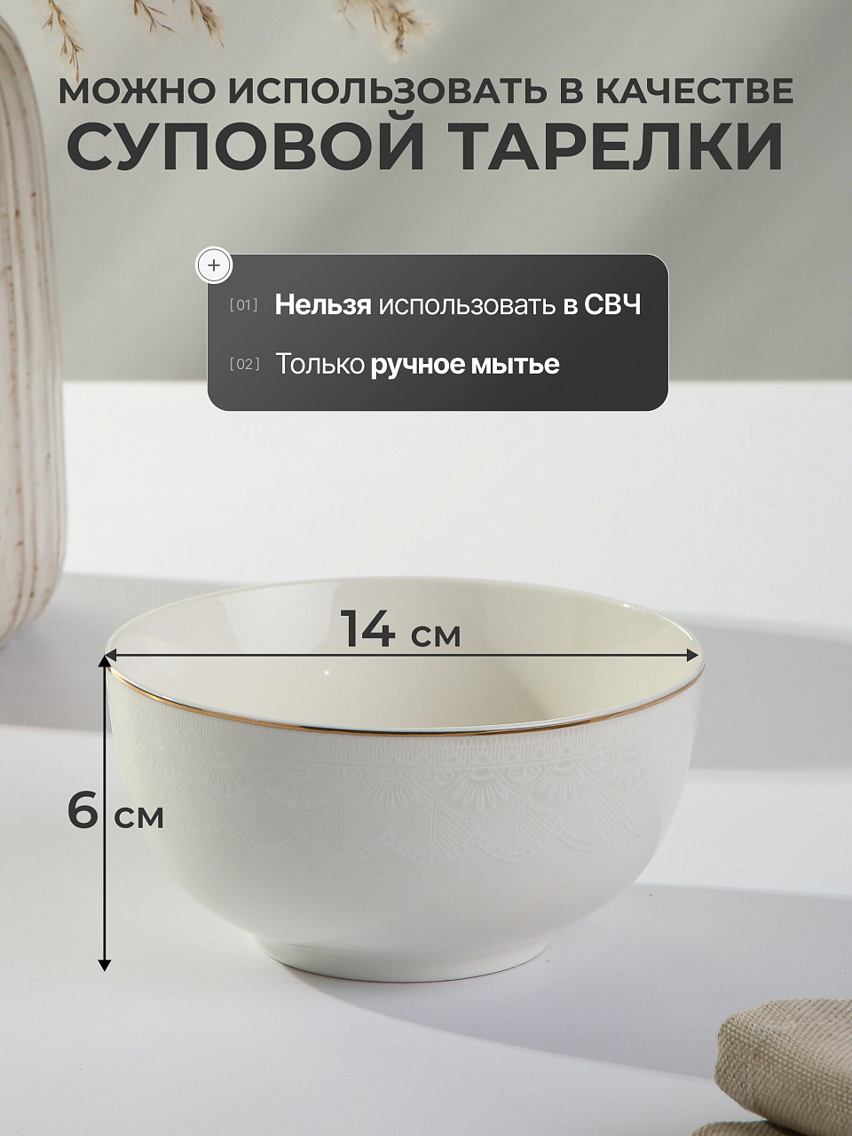 - Оптимальный объём: диаметр 14 см, высота 6 см — удобно для салатов, закусок и десертов; фарфор сохраняет свежесть продуктов
