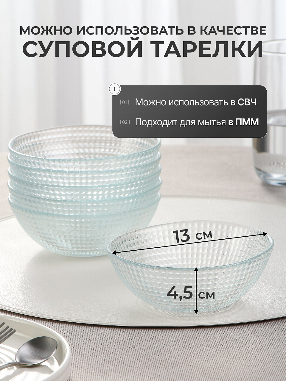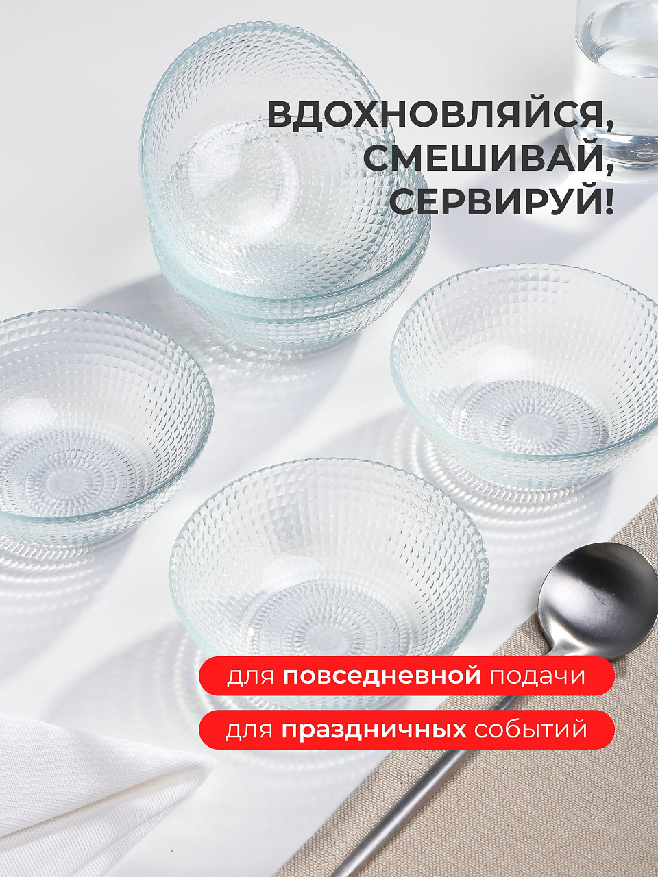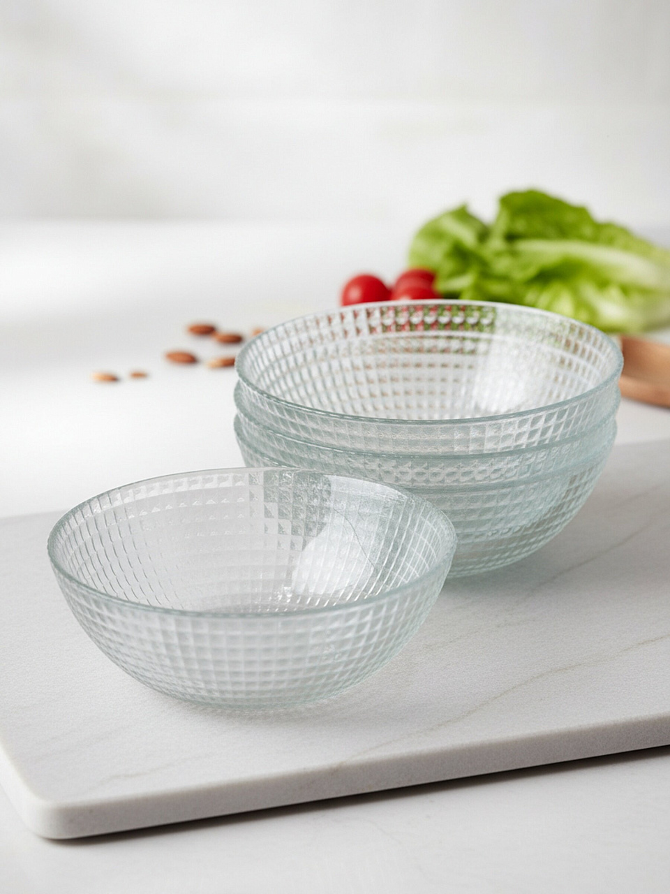 - Экологичное стекло: 6 салатников по 300 мл, подходят для посудомоечной машины, не впитывают запахи и легко моются.