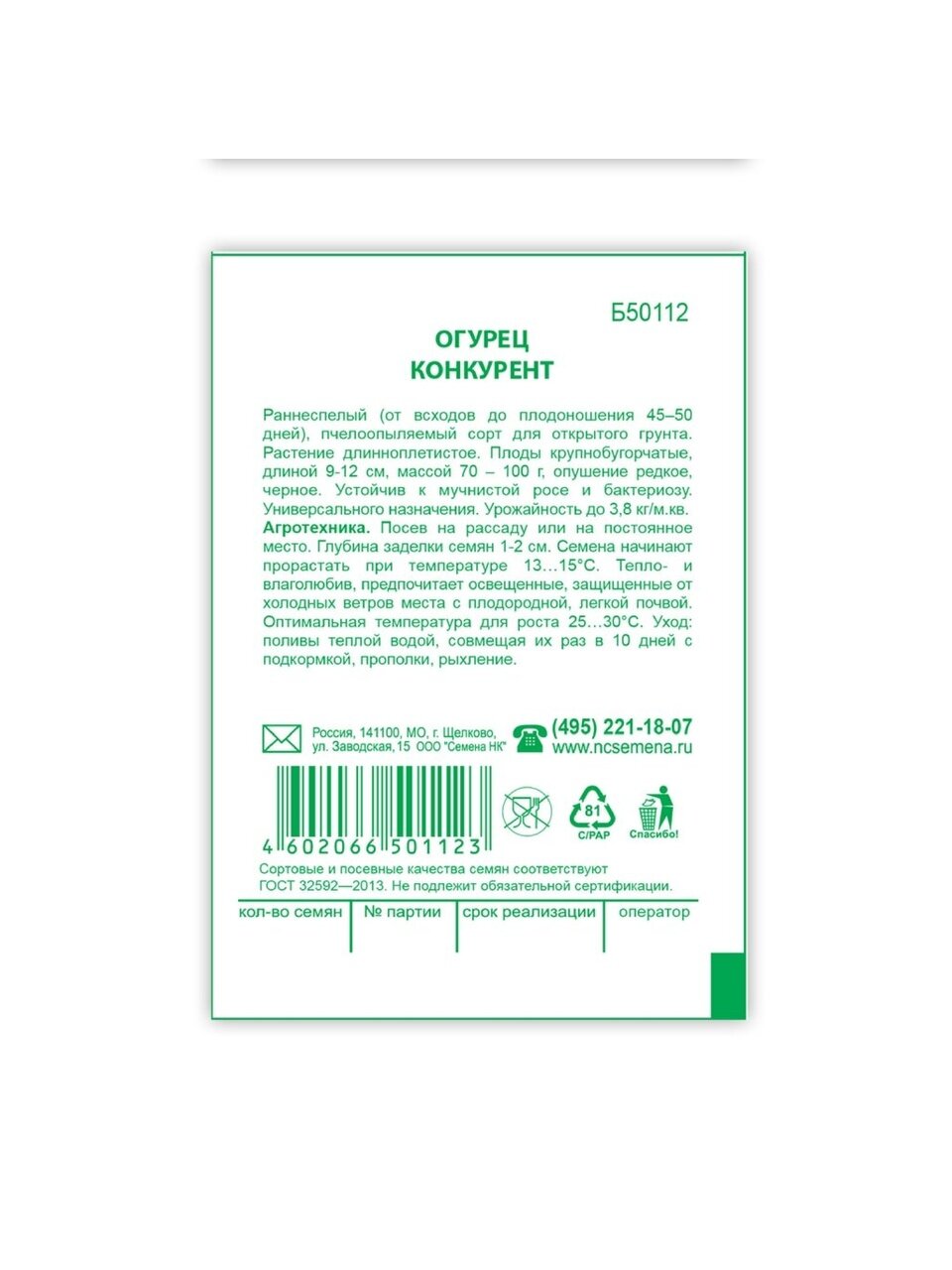 Семена поставляются в белой упаковке, что подчеркивает их чистоту и качество. Продукт от российского производителя.
