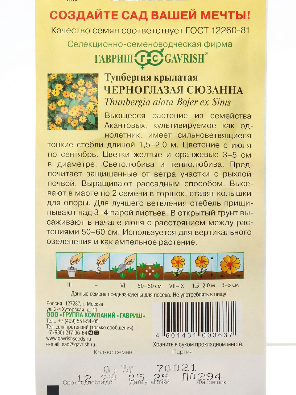 Семена тунбергии крылатой Черноглазая Сюзанна от бренда Гавриш — выбор для тех, кто хочет купить недорого быстрорастущие цветы для дачи или балкона. Благодаря однолетнему циклу и высокой всхожести, тунбергия легко выращивается даже новичками. Растение образует густой лиственный покров и обильно цветёт с середины лета до осени, создавая эффектный акцент на любой опоре или в подвесных кашпо.
