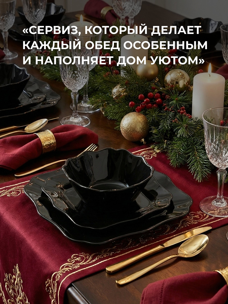 - Уникальный дизайн: резной край 1/4 и глубокий черный цвет создают премиальный акцент на любом столе