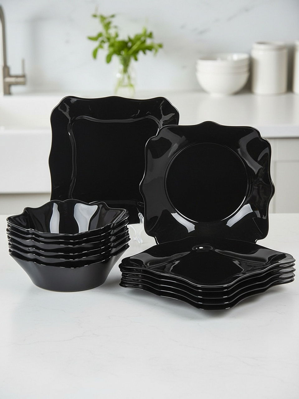 Элегантный столовый сервиз из стеклокерамики на 6 персон: 13 предметов, черный цвет, резной край — идеальный подарок и стиль для вашего дома