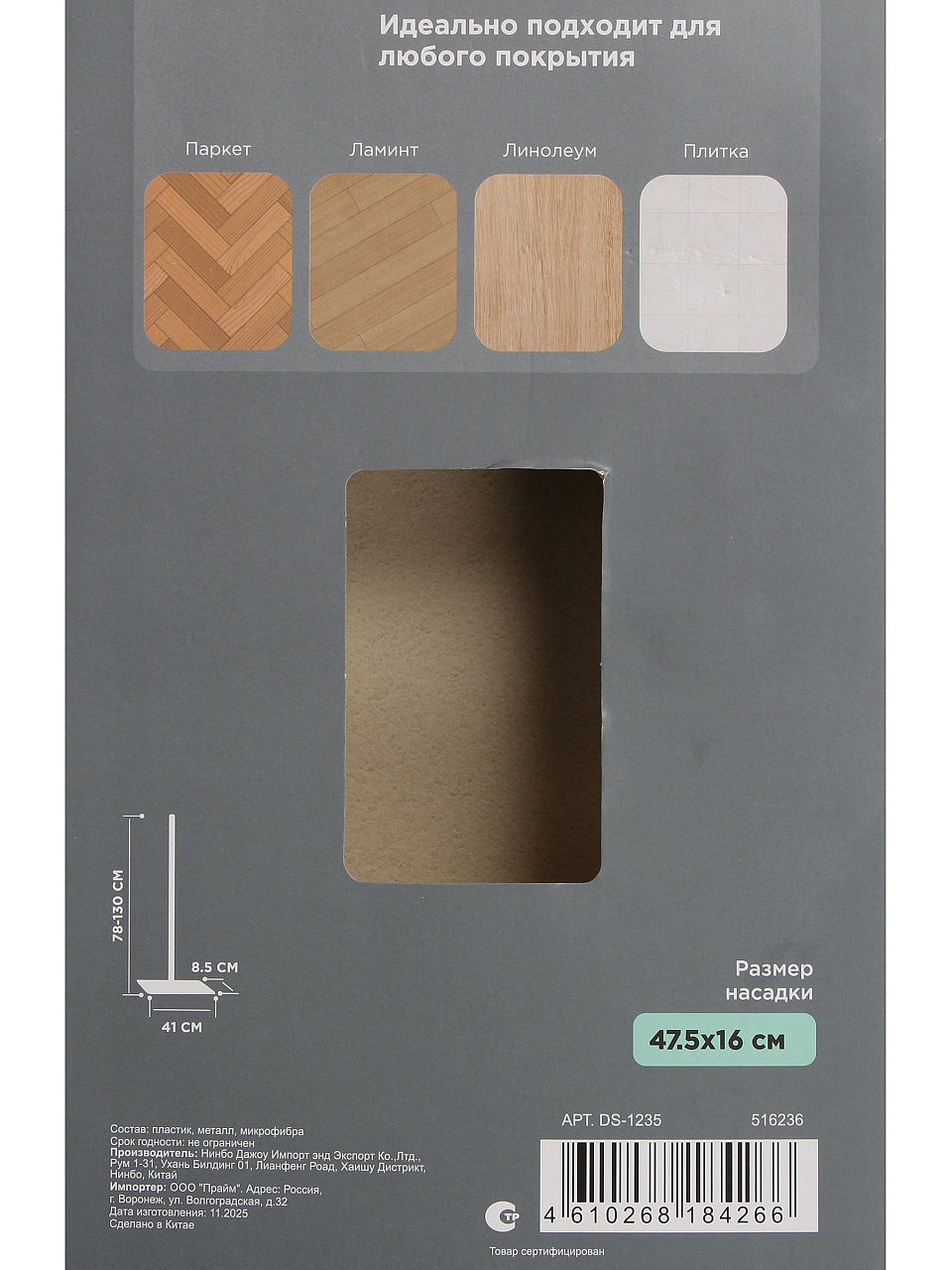 - Универсальность применения: микрофибра премиального качества бережно очищает ламинат, кафель и керамогранит, не оставляя царапин и лишней влаги.