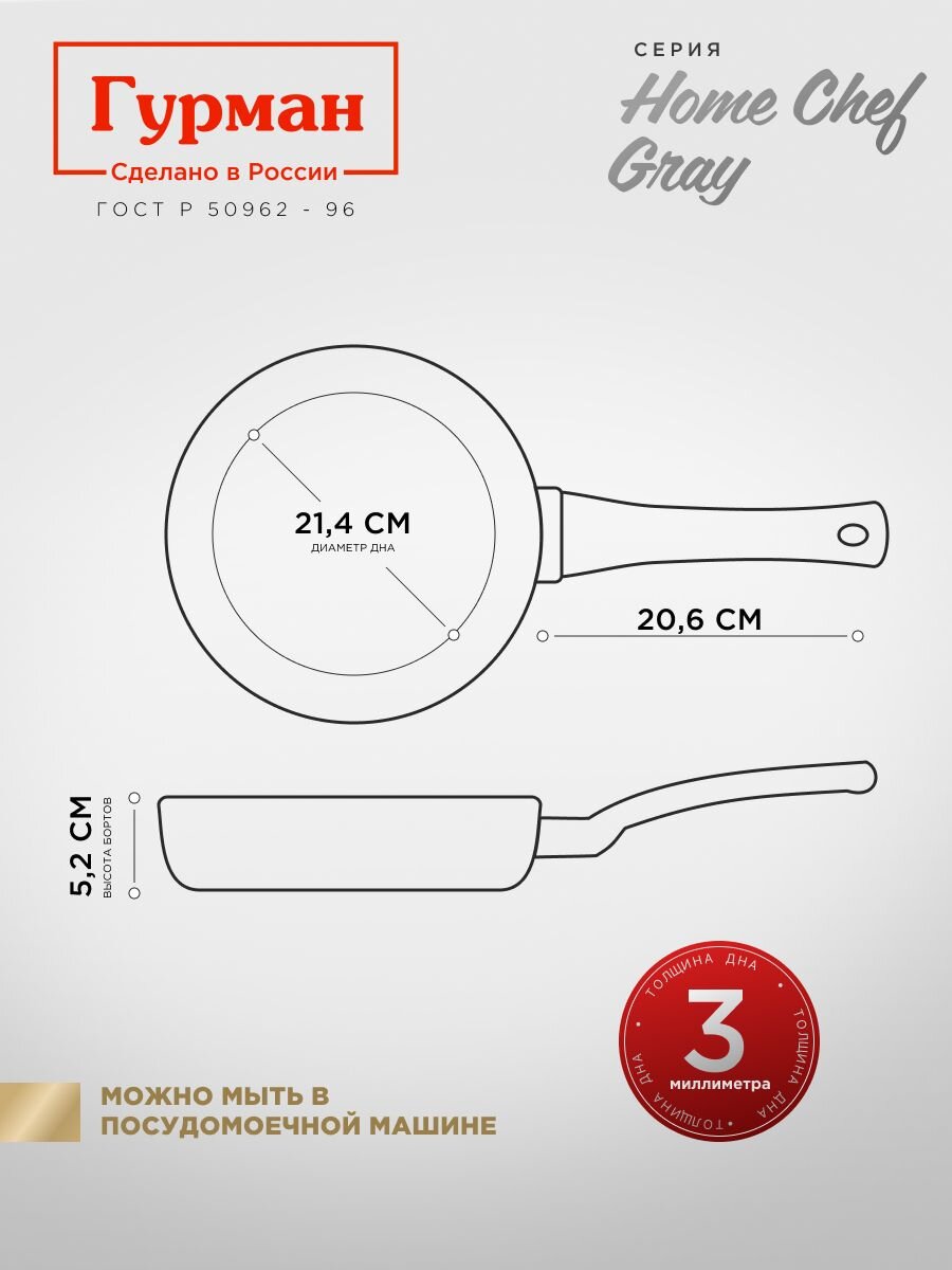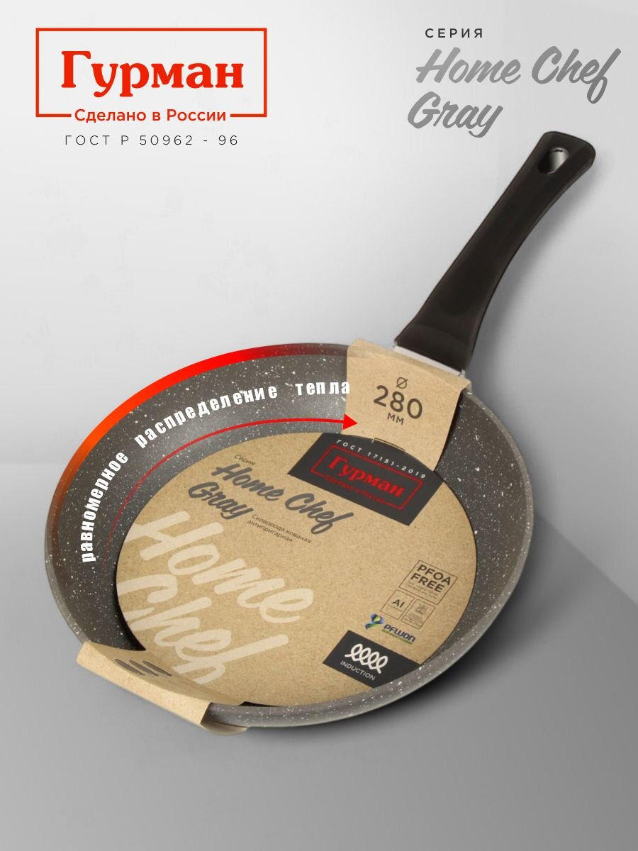 Если вы ищете, какую сковороду купить для индукционной плиты и ежедневного использования, обратите внимание на модель HomeChef Gray от бренда Гурман. Лёгкий алюминий обеспечивает быстрый нагрев и экономию времени, а антипригарное покрытие PFLUON позволяет готовить без масла, сохраняя вкус и пользу продуктов. Диаметр 28 см оптимален для семейных ужинов, приготовления мяса, рыбы, яичницы, оладий или омлета.