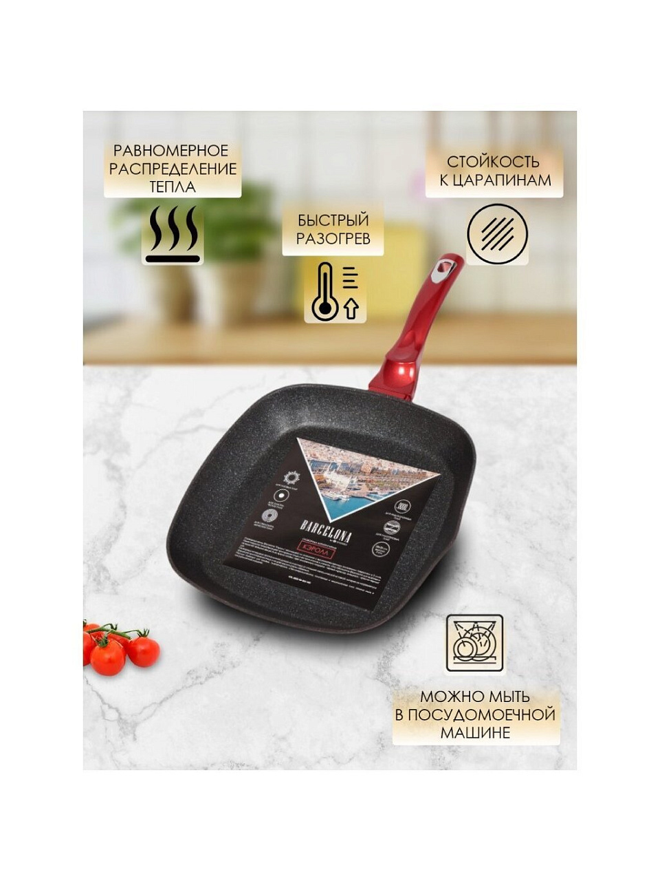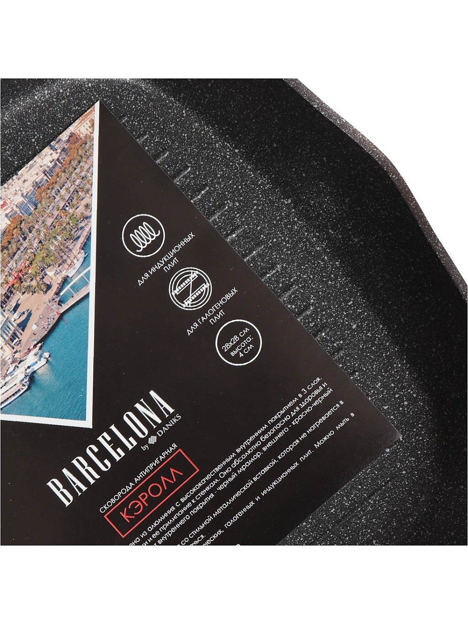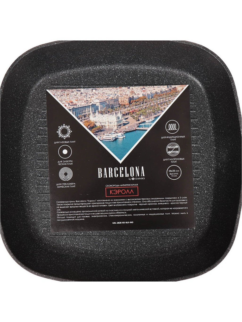 Сковорода-гриль Barcelona "Кэролл" изготовлена из алюминия с высококачественным внутренним покрытием в 3 слоя. Такое покрытие предотвращает пригорание пищи и ее прилипание к стенкам. Оно абсолютно безопасно для здоровья и не выделяет вредных веществ во время готовки. Цвет внутреннего покрытия - черный мрамор, внешнего - красно-черный лак.