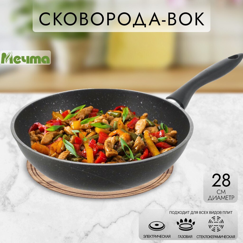Сковорода-вок 28 см из литого алюминия с антипригарным гранитным покрытием Мечта Гранит 78701 — быстрое приготовление блюд без прилипания и лишнего масла.