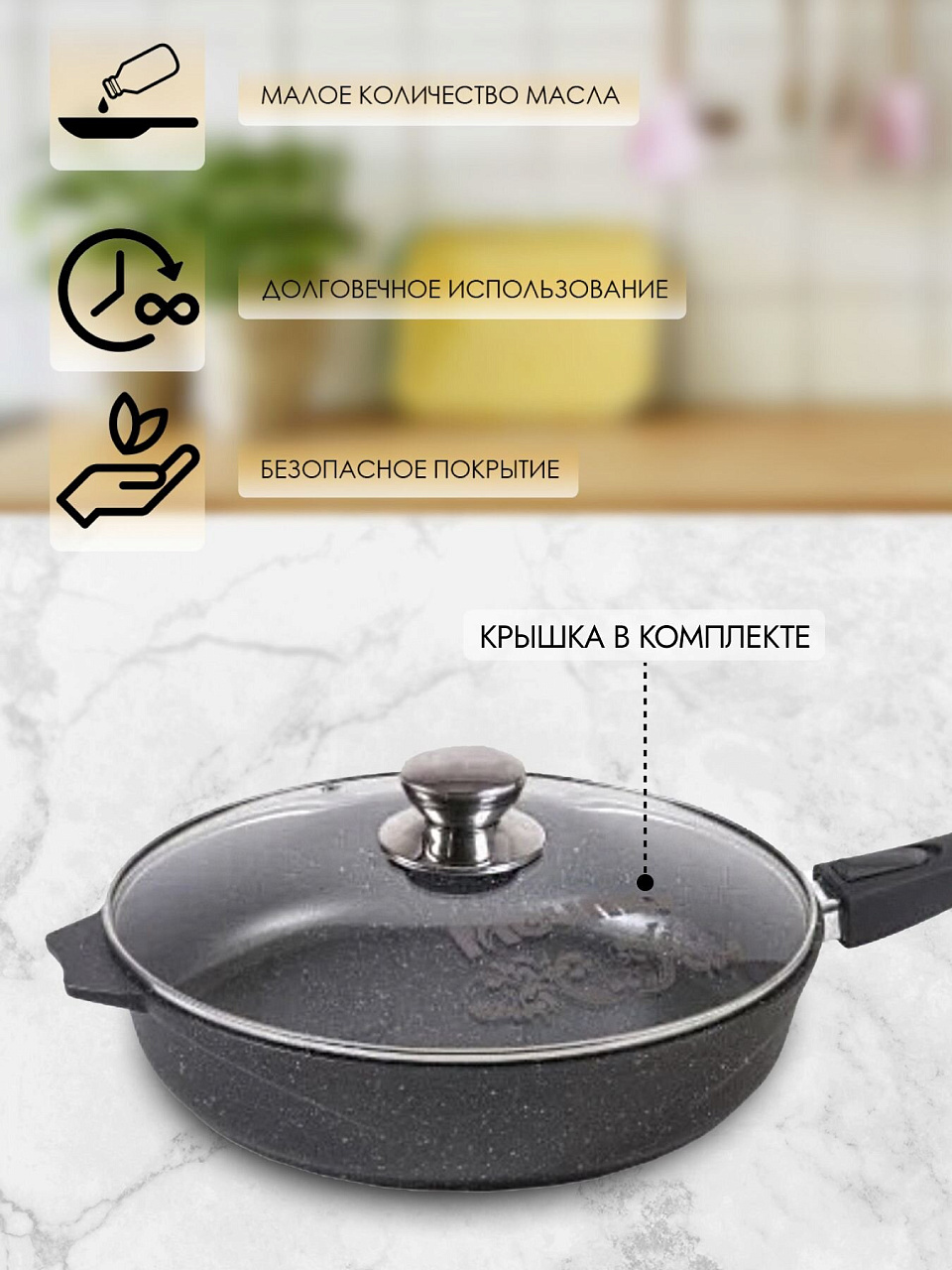 Сковорода Мечта Гранит black 28 см: литой алюминий, антипригарное покрытие, крышка и съемная ручка — решение для вкусных и здоровых блюд без пригорания.