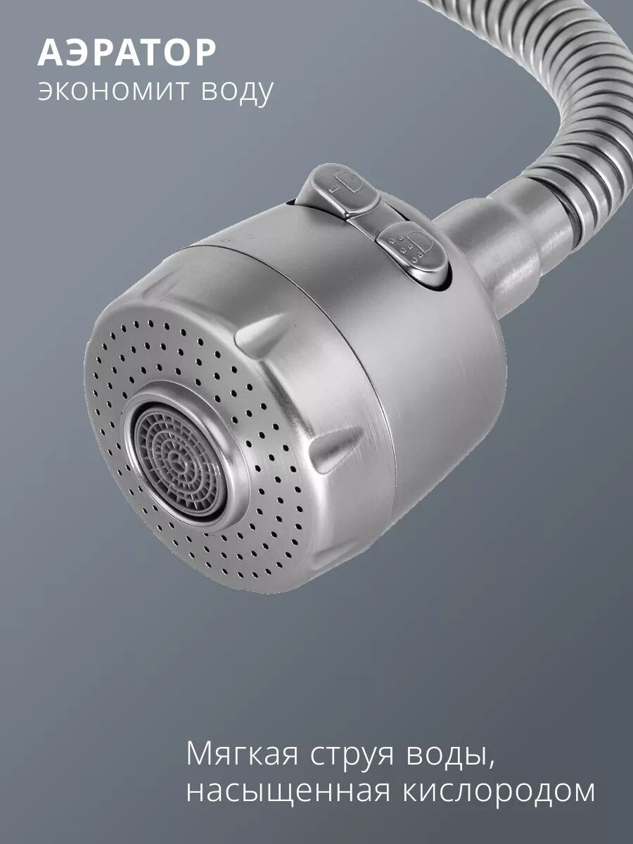 - Гибкий излив 35 см — легко направлять поток воды, удобно мыть крупную посуду и наполнять высокие ёмкости