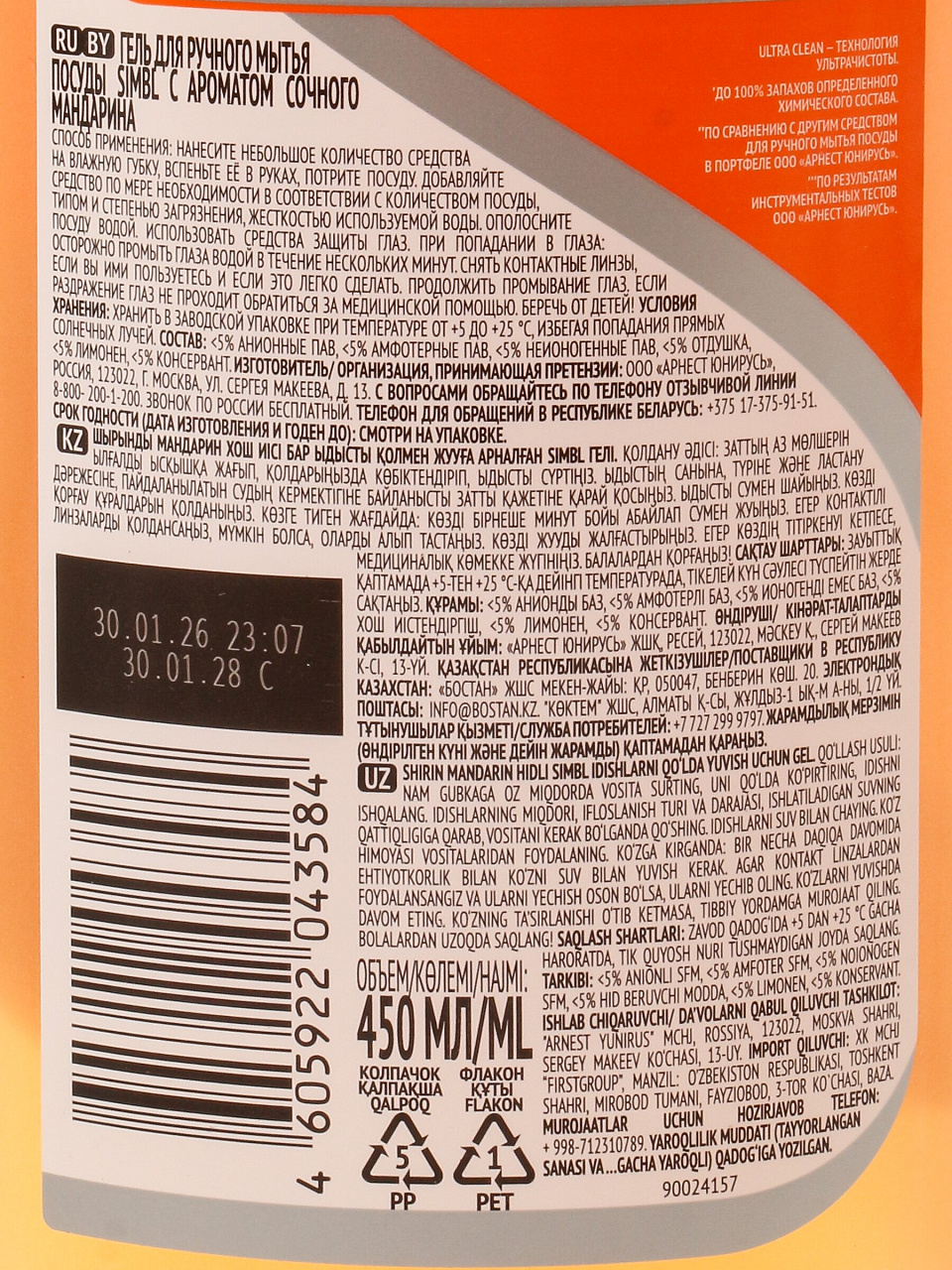Средство для мытья посуды Simbl 450 мл с ароматом сочного мандарина — чистота без усилий, приятный свежий запах и экономичный расход для вашего дома и дачи.