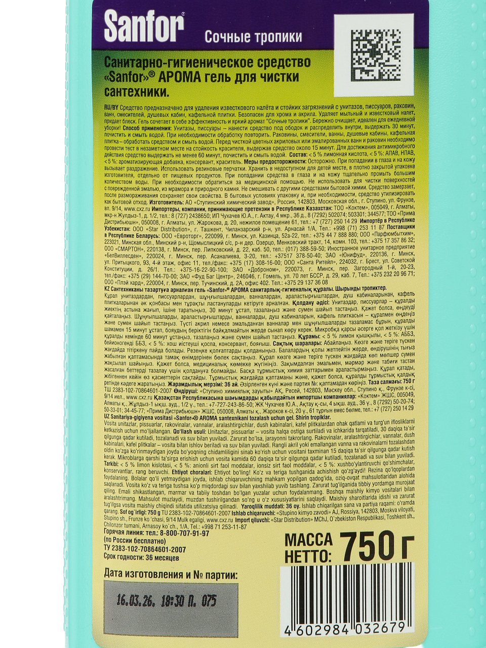 - Мощная формула геля Sanfor — эффективно растворяет даже стойкие загрязнения и налёт, придаёт свежий аромат тропиков.