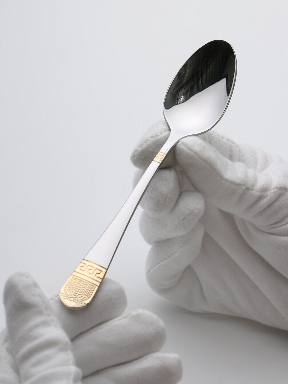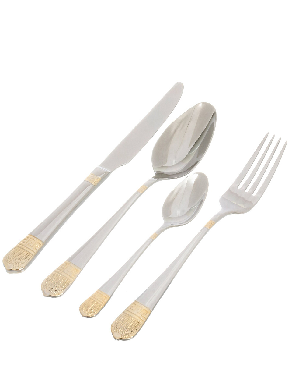 В наборе 24 предмета на 6 персон: столовые и чайные ложки, вилки и ножи из нержавеющей стали с золотым напылением, без подставки.