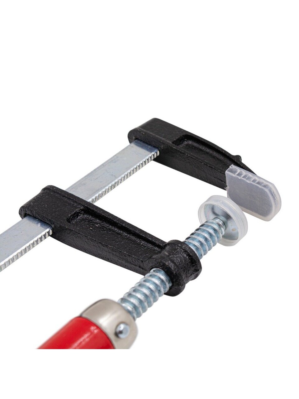 F-образная струбцина имеет вид рамы с подвижным элементом, движение которого и позволяет осуществлять фиксацию. Подобное оснащение определенно заинтересует профессионалов. Струбцина производится из качественных материалов.