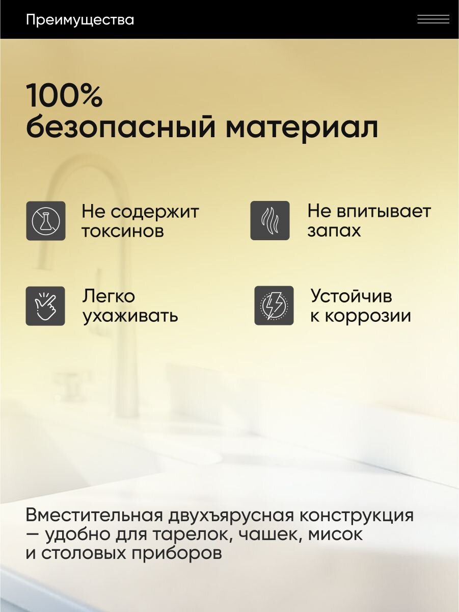 Благодаря продуманной конструкции, сушилка подходит для размещения тарелок, чашек и столовых приборов, обеспечивая их быстрое высыхание. Универсальность аксессуара делает его незаменимым помощником для поддержания чистоты и порядка после мытья посуды. Изделие легко очищается, не подвержено коррозии и деформации, что гарантирует долгий срок службы даже при интенсивном использовании.