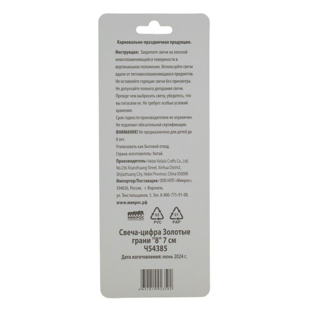 Вы можете приобрести «Свеча для торта, 7 см, Микрос, Золотые грани Цифра №8, Ч54385» и другие товары в нашем интернет-магазине в Астрахани по низким ценам и с бесплатным самовывозом.
