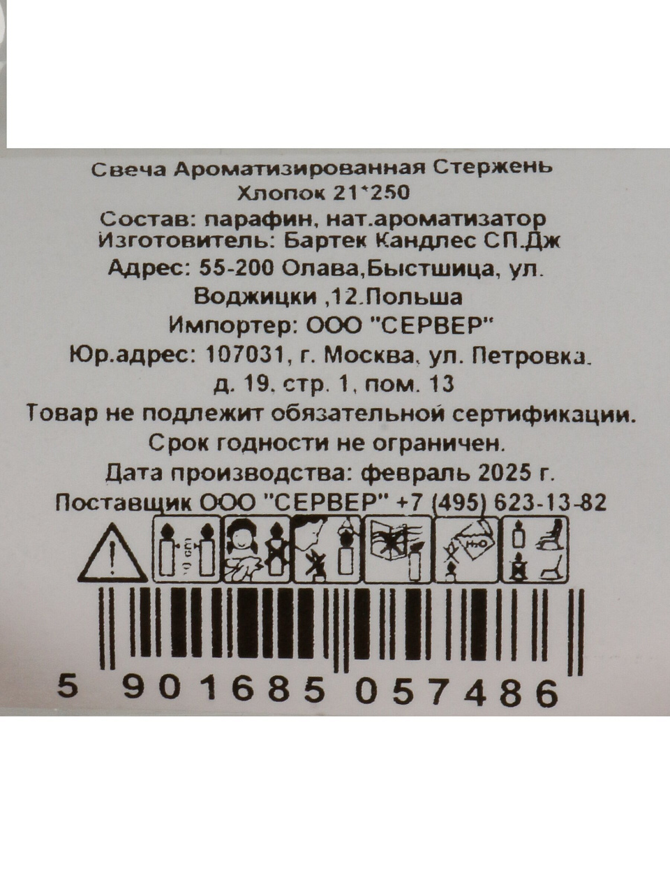Вы можете приобрести «Свеча ароматизированная, 25х2.1 см, стержень, Bartek Candles, Хлопок, классическая, 90 гр» и другие товары в нашем интернет-магазине в Обнинске по низким ценам и с бесплатным самовывозом.