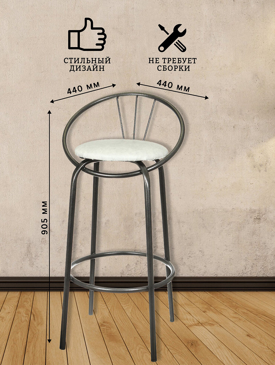 Габариты: глубина 440 мм, ширина 435 мм, высота 905 мм. Высота сиденья от пола — 720 мм, оптимально для стандартных барных стоек.