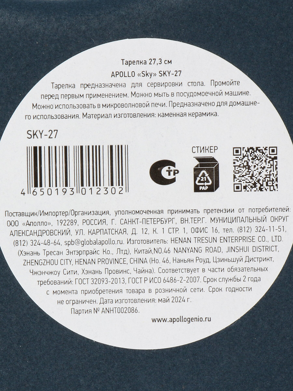Вы можете приобрести «Тарелка обеденная, керамика, 27.3 см, круглая, Sky, Apollo, SKY-27» и другие товары в нашем интернет-магазине в Железногорске по низким ценам и с бесплатным самовывозом.