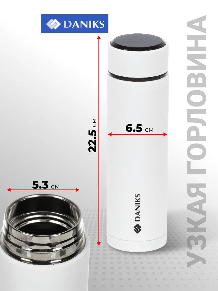 Термос Daniks 0.48 л с датчиком температуры: держит тепло и холод до 24 часов, корпус — нержавеющая сталь, стильный белый дизайн для города и автомобиля.