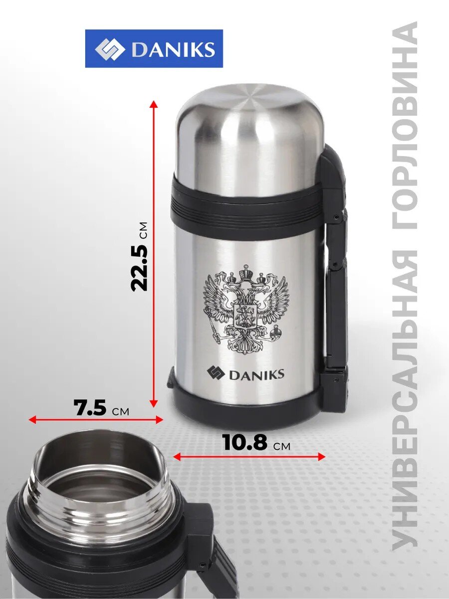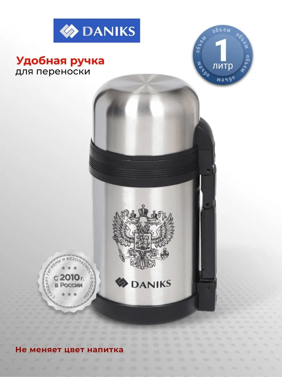 Термос Daniks 1 л из нержавеющей стали с широкой горловиной — сохраняет тепло и холод до 24 часов, удобен в дороге, дома и на даче. Ударопрочный корпус и ремешок для переноски.
