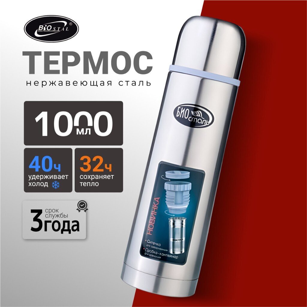 Термос Biostal 1 л из нержавеющей стали — держит напитки горячими до 32 часов, удобная узкая горловина, ударопрочная конструкция для любых условий.