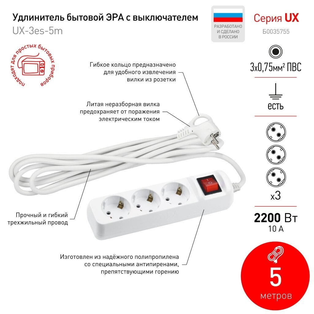 Удлинитель электрический Эра UX-3es-5m рассчитан на максимальную мощность 10 А/ 2200 Вт. Удлинитель Эра станет Вашим надежным помощником, если любимые электроприборы находятся далеко от розеток. Провод в удлинителях Эра сделан из 100% меди, что делает его абсолютно пожаробезопасным. Корпус выполнен из ударопрочного и негорючего пластика (полипропилен). Вилка обеспечена кольцом для удобного извлечения ее из розетки. Модель удлинителя на 10 А позволяет подключить бытовые приборы общей нагрузкой до 2200 Вт. Дизайн удлинителя разработан в России командой Эра Style.