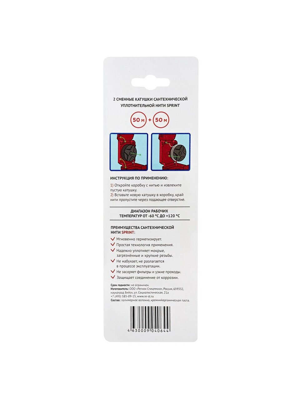Набор сменных катушек. Нить имеет плоское сечение и улучшенную пропитку. Надежно герметизирует металлические и пластиковые резьбы, защищает поверхность резьбы от коррозии, соединение остается герметичным в условиях вибрации и его можно регулировать на угол до 180. Нить SPRINT идеально подойдет для срочного ремонта или быстрого монтажа.