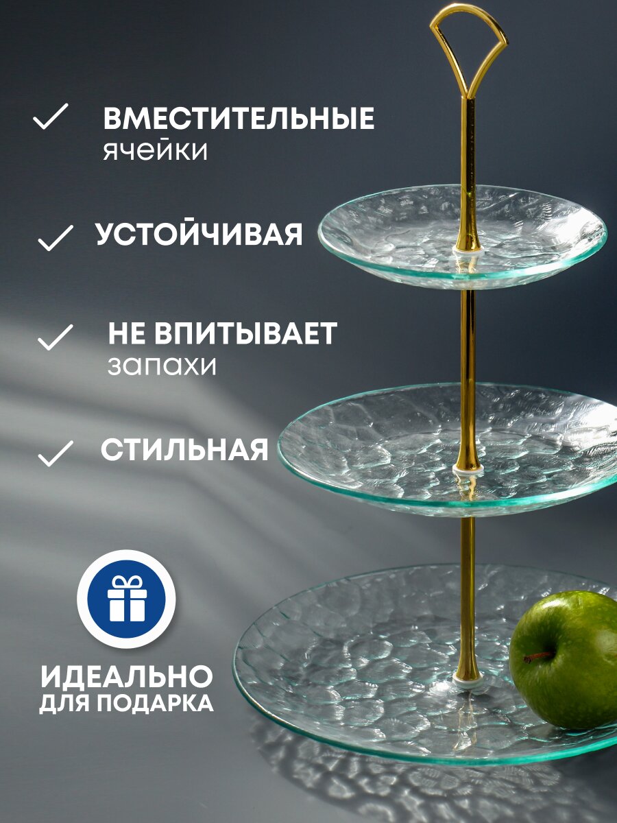 В отличие от одноярусных блюд, эта этажерка экономит место, а прозрачное стекло гармонирует с любым стилем. Не используйте в микроволновке и посудомоечной машине — ручная мойка продлит срок службы.