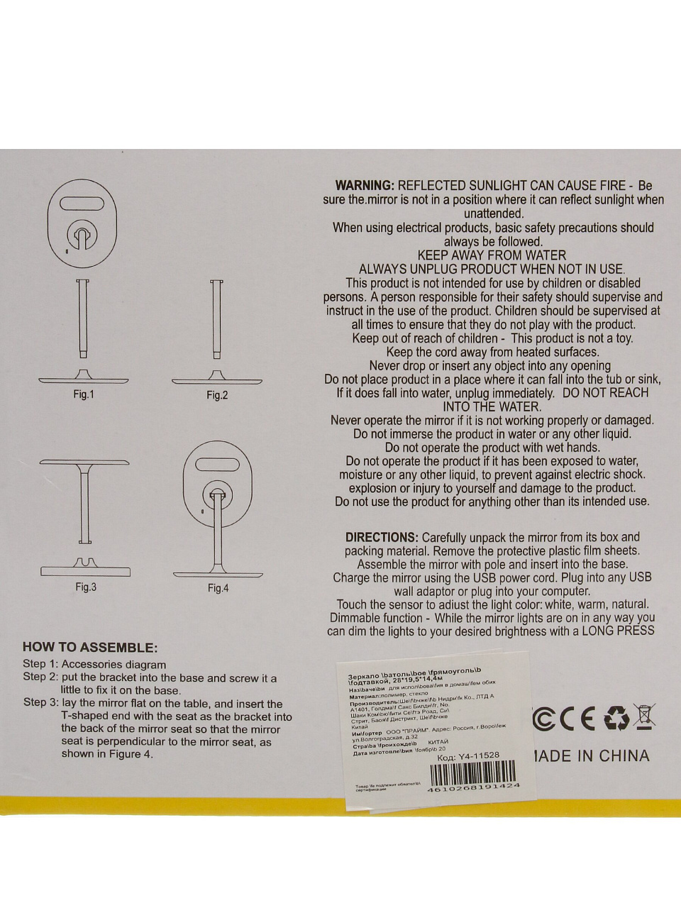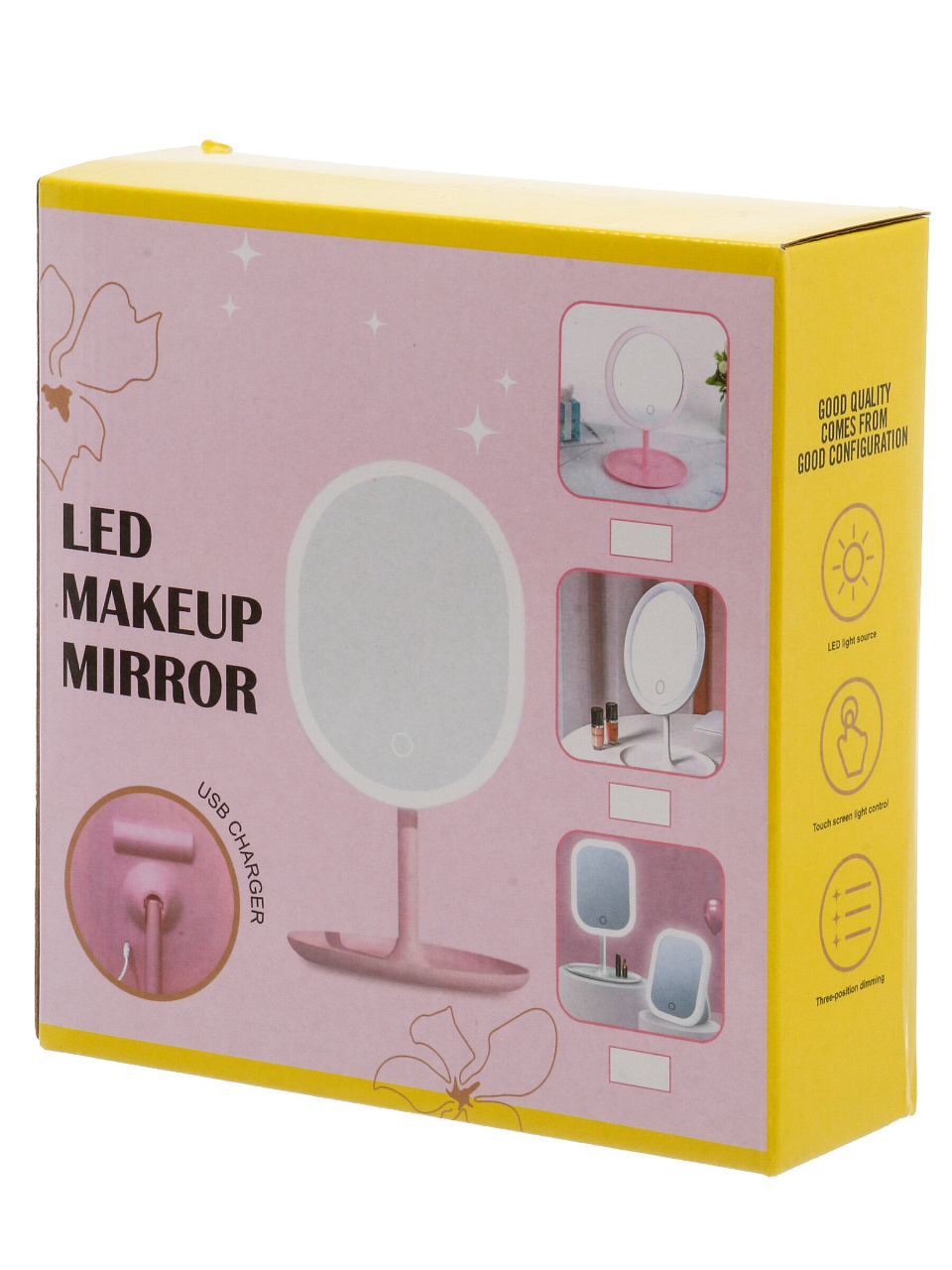 Зеркало выполнено из прочного полимера и стекла, устойчиво стоит на подставке и не требует дополнительного крепления.