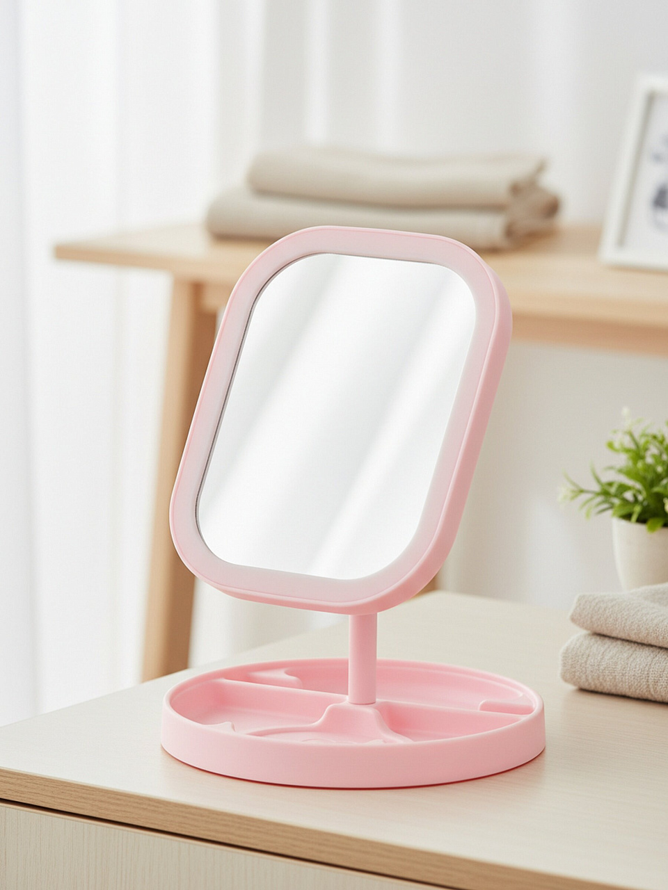 Настольное зеркало с подставкой — это универсальный аксессуар для ежедневного ухода за собой. Благодаря среднему размеру и прямоугольной форме зеркало удобно размещать на туалетном столике, полке или рабочем столе. Часто спрашивают: «Как выбрать настольное зеркало для макияжа?» — оптимально подбирать модели без увеличения, если нужен естественный обзор, как у этой модели. Для хранения косметики или аксессуаров подставка станет дополнительным плюсом.