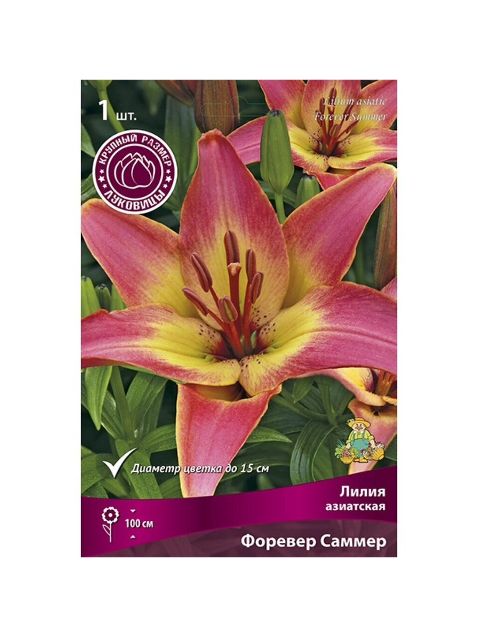 В упаковке — 1 луковица азиатской лилии сорта Форевер Саммер, разбор 16-18/К, что гарантирует крупные цветы и продолжительное цветение.