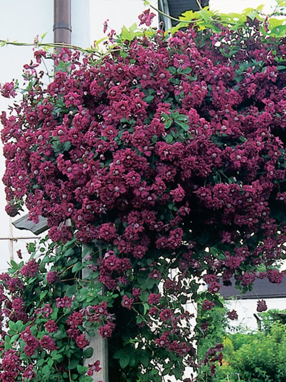 - Махровые пурпурные цветы уникальной формы — редкость среди клематисов, декоративный акцент на любом участке.